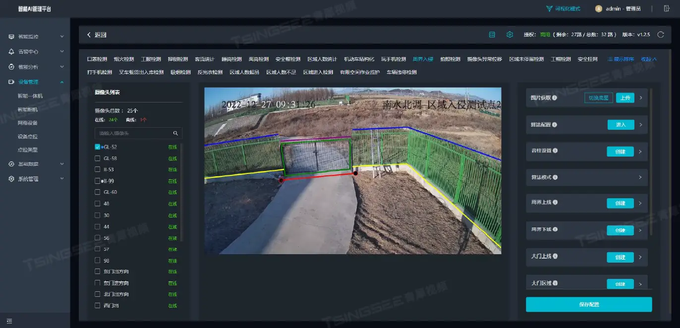 智能分析网关V4内置了近40种AI算法模型,支持对接入的视频图像进行人、车、物、行为、烟火等实时检测分析,上报识别结果,并能进行语音告警播放。硬件管理平台支持RTSP、GB28181协议以及厂家私有协议接入,可兼容市面上常见的厂家品牌设备,可兼容IPC、网络音柱等,同时也支持AI智能摄像头的接入。对于已部署有算法的AI智能摄像头(如:AI烟火摄像机),平台也能接收和展示摄像头上传的告警信息。在非煤矿山场景中可应用的算法有: