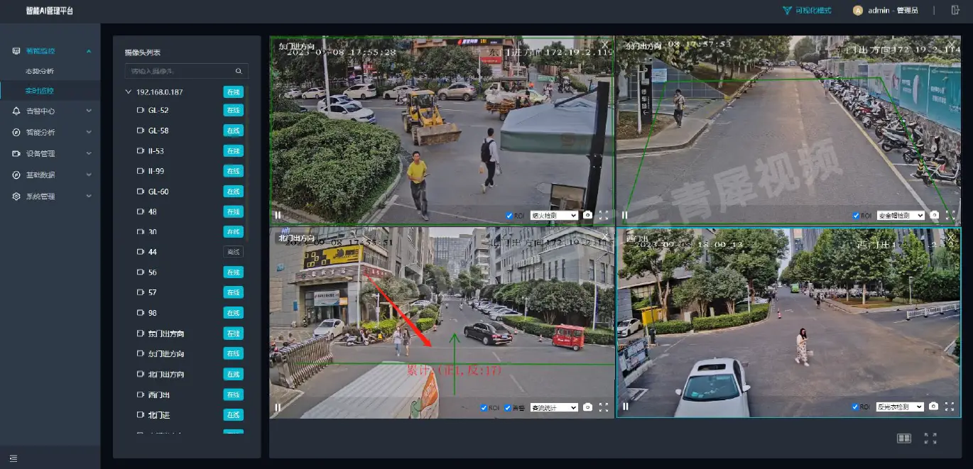 利用智能分析网关V4的实时监控与视频调阅功能,可以掌握矿区的实时生产动态和现场状况。硬件平台可对添加的IPC设备进行实时监控,可任意选择一路或多路视频流查看,支持全屏、单屏、4分屏、9分屏、16分屏浏览,支持抓拍截图,自动将抓拍的截图保存在本地,支持查看算法任务的ROI区域和客流统计的实时累积数据。