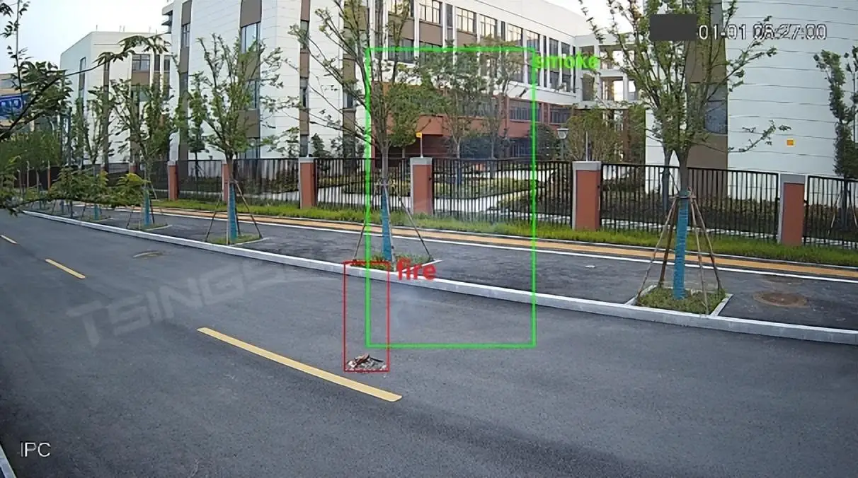 - AI烟火检测摄像机:将校园内的普通网络摄像机更换为AI烟火检测摄像机,并接入智能分析网关V4平台中,基于摄像机内部署的烟火识别算法,当检测到疑似烟火的场景时,将立刻对现场进行抓拍、上传至管理平台,提醒校园安保人员及时查看和处理。