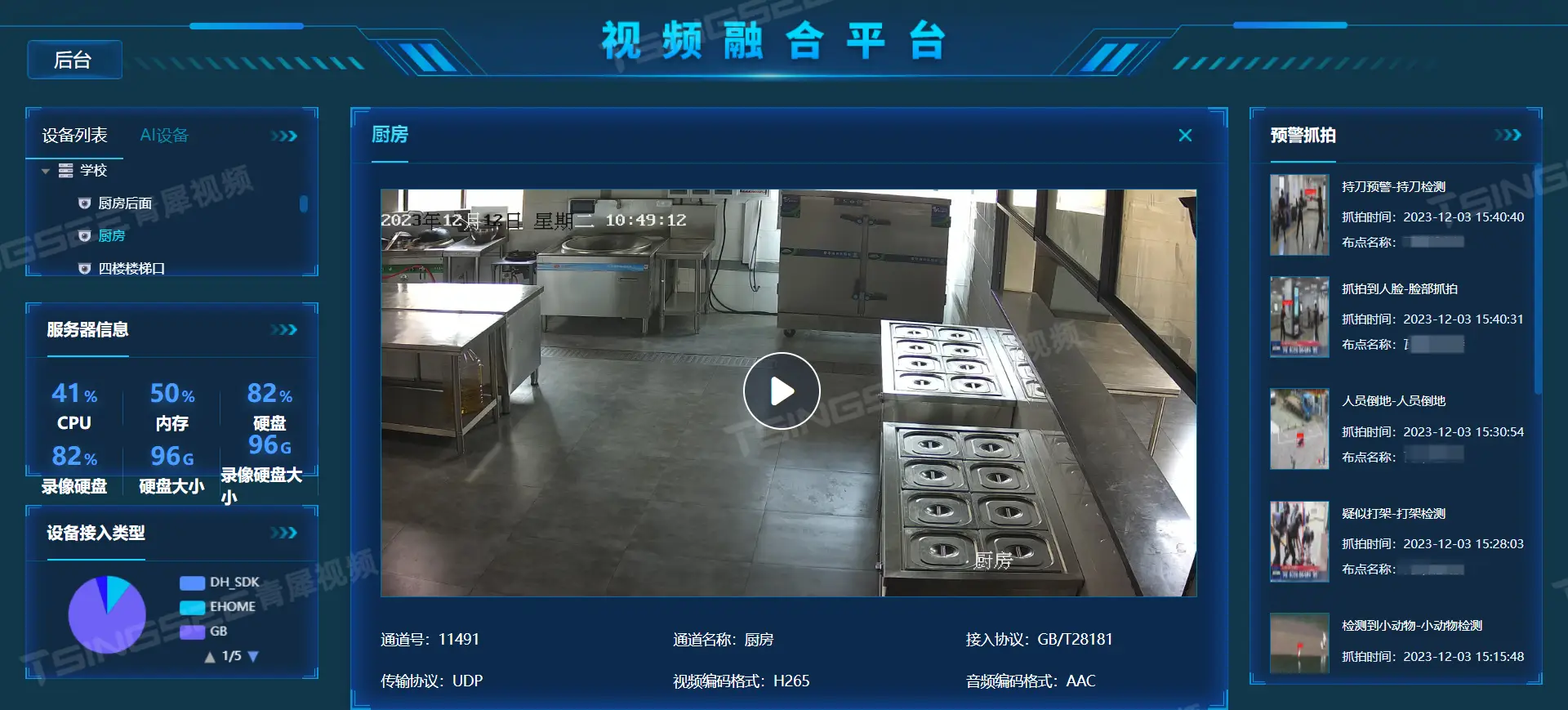 2)随后将学校或餐厅的监控设备通过国标GB28181协议或者海康Ehome的形式接入到公网服务器;