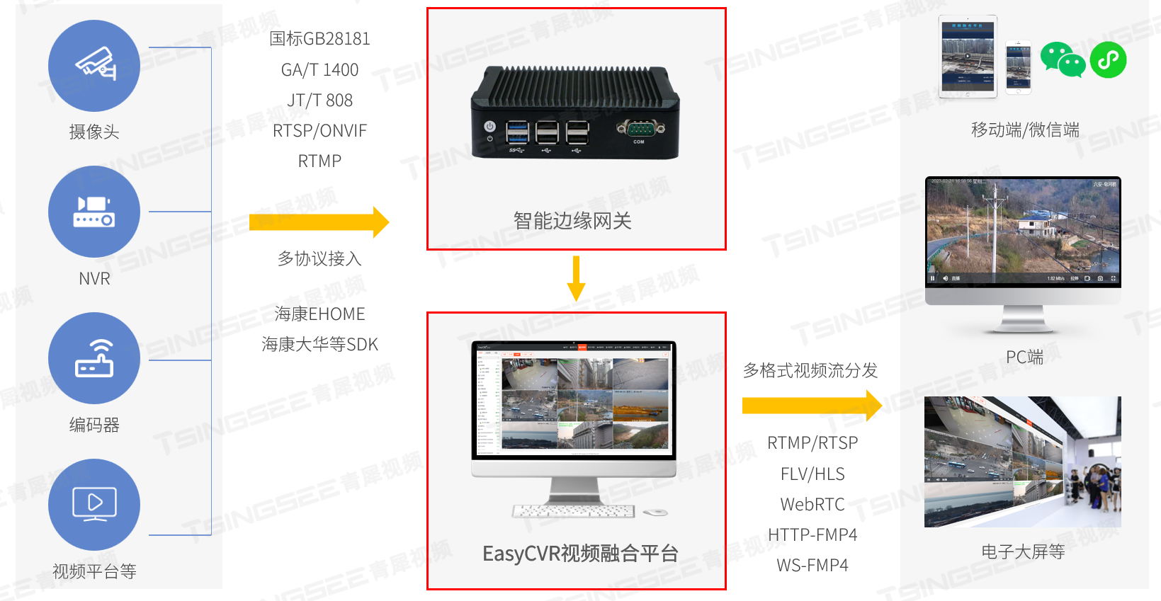 TSINGSEE青犀视频EasyCVR视频汇聚网关具有很强的视频汇聚融合、输出能力,能实现海量前端设备的接入/转码/分发/监控直播等,已经不局限于视频监控本身了,特别是目前视频资源和应用场景日益丰富的情况下,一款功能丰富、处理能力强、兼容性强的视频网关设备可以与各种视频相关项目配套使用,让各种视频项目落地更轻松。