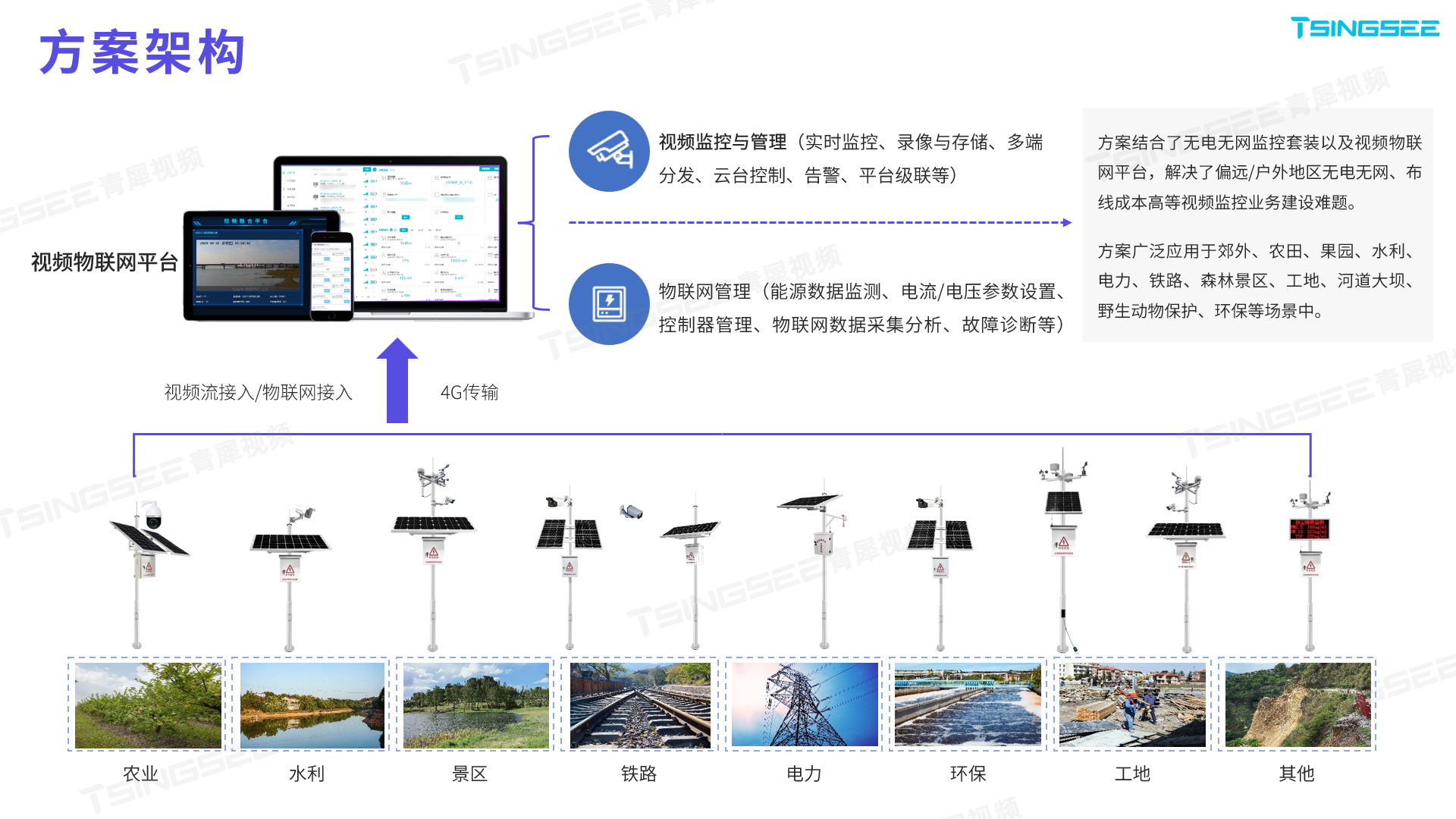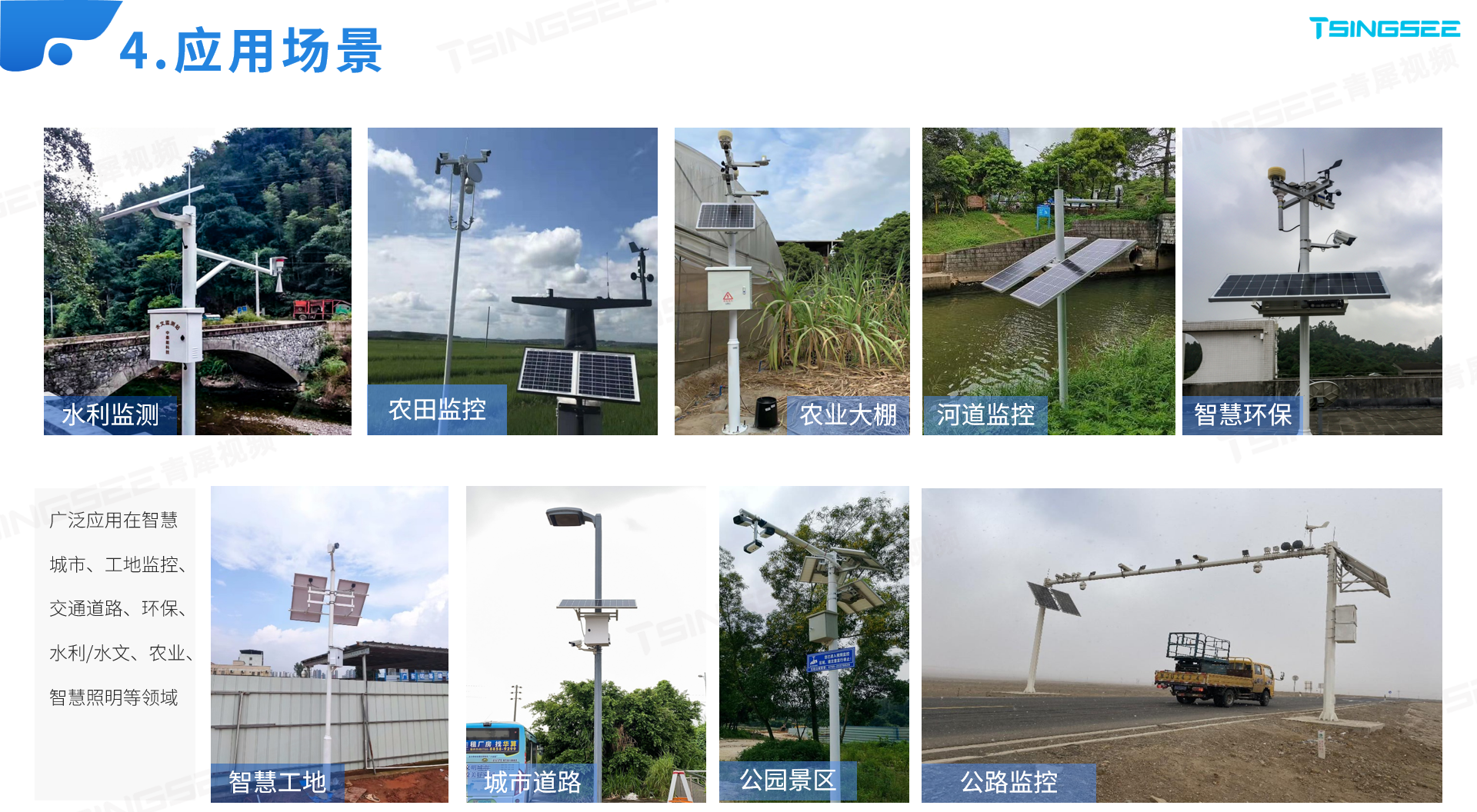 - 应用场景广泛:满足农业种植/养殖、景区、森林防火、电力、铁路防灾、市政道路监管、工地防盗、环保监督排污、河道水利等场景监管需求;