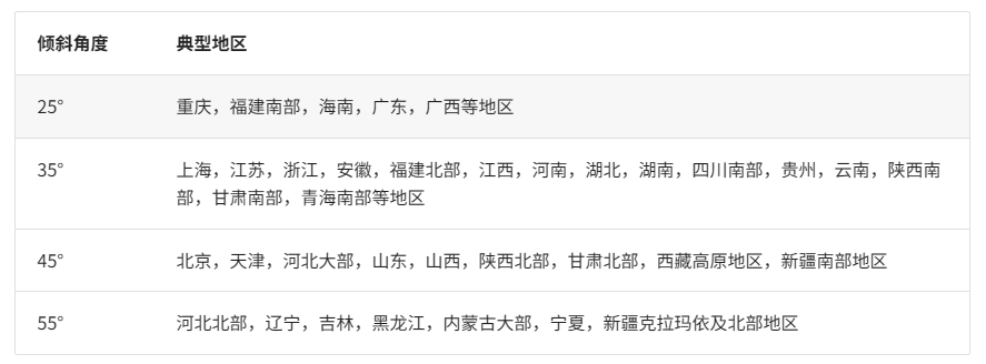 根据安装位置,确定太阳能帆板安装的倾斜角度,以获得最大的太阳能量。总的原则是北半球方位角朝正南方向,南半球朝正北方向。以下是推荐的国内典型地区太阳能帆板安装倾斜角度。