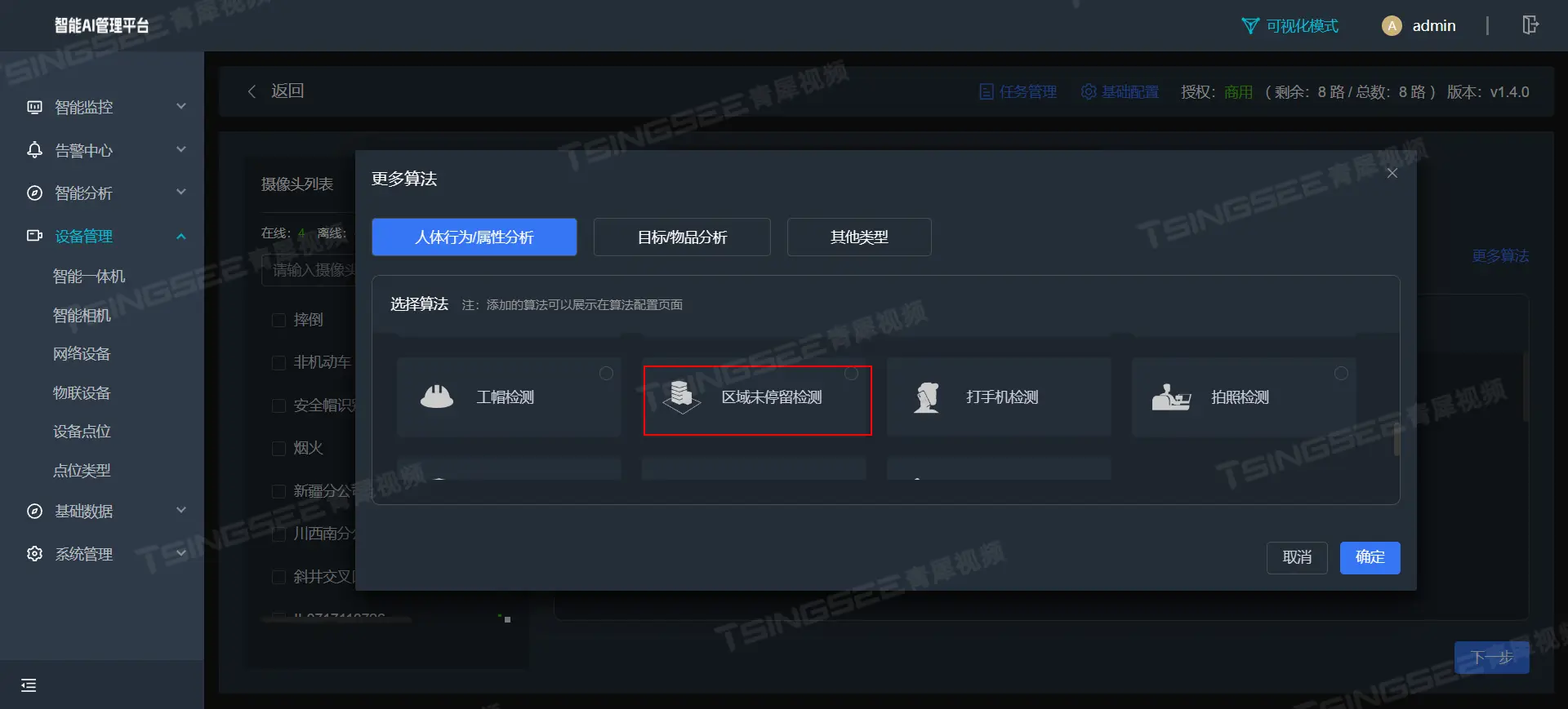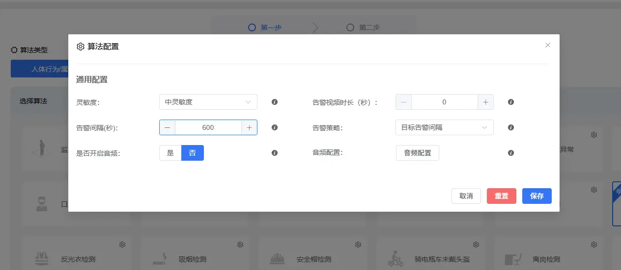 - 算法丰富:内置近40种AI算法模型,涵盖人脸、人体、车辆、车牌、行为分析、烟火、入侵、聚集、安全帽、反光衣等多个方面,可按需组合、按场景配置,满足不同领域的多样化需求。