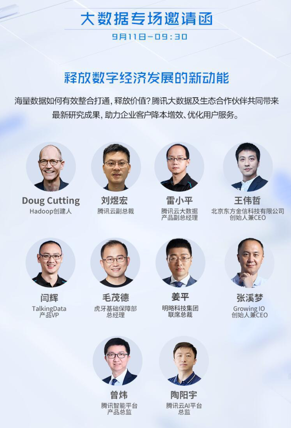9月11日(本周五),腾讯多支顶尖大数据团队携手打造「大数据专场」,邀请 Hadoop 之父 Doug Cutting 等多位行业大咖、生态合作伙伴,共论大数据发展的前沿趋势,并聚焦探讨泛互联网、营销、政务等多个领域的最佳实践,释放数字经济发展的新动能。