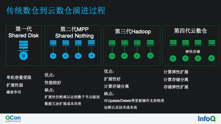 我们首先来看数据仓库的演进过程,数据仓库到目前为止大致分为 4 代,在第一代,数据库主要应用于 OLTP 场景,并采用共享存储架构, 因此被称为事务型数据库。这一阶段,由于 OLAP 场景尚不成熟,因此分析型数据库(即“数据仓库”) 尚未完全从事务型数据库中完全脱离出来,以采用 Oracle、DB2 等共享存储架构的事务型数据库为主。在这一阶段,数仓存在的问题是价格昂贵,且受到共享存储架构影响,可扩展性较差,扩展到十几个节 点就会遇到存储瓶颈,仅能适应面向管理层的报表分析需求,但无法适应更大规模、更多用户的数据分析场景。