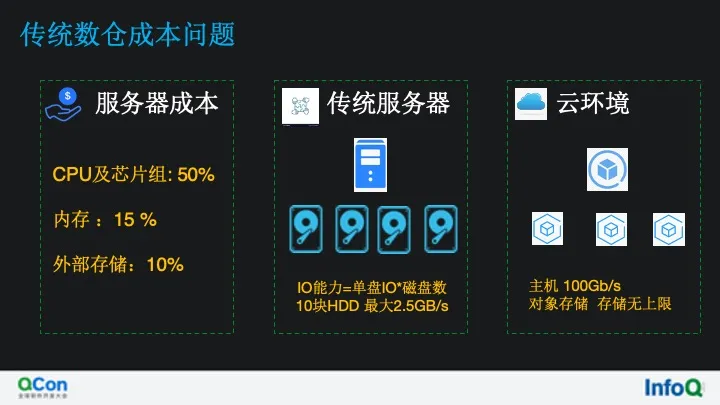 再从性能角度看,一台服务器 IO 磁盘 IO 能力为单盘 IO* 磁盘数,出于成本考虑,假设采用的是 HDD 的设备,10 块盘的设备其磁盘 IO 能力约是 2.5GB/s,而随着在云环境下硬件架构演进,整机网络 IO 能力都是 100GB 起,其 IO 能力远超普通磁盘 IO 能力,同时结合合理的索引以及数据结 构设计,能够带来更强的数据扫描能力,同时云上对象存储的容量可以理解为无上限,可以让存储集群 的维护成本降为 0,其按存储量计费的模式,可以大大降低存储成本,云上海量的计算资源可以保证数据 仓库的计算需求,那么我们接下看基于云的存储计算分离、资源弹性、统一存储如何构建云上云原生数仓。