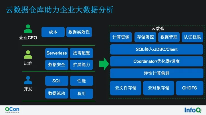 站在云数据仓库视角看,主要满足企业中三种角色人员的需求,云的发展让 IAAS 进入了工业化时 代,而云数仓的目的也是要让数据分析进入工业化时代