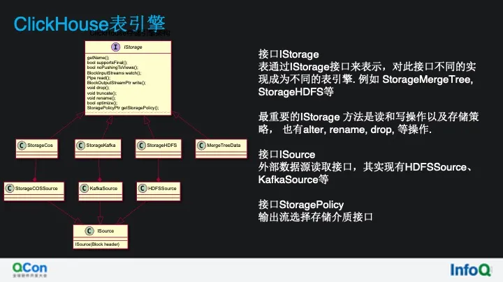 在 clickHouse 中存储引擎有两个比较重要重要的接口,IStorage 和 ISource表通过 IStorage 接口来表示,对此接口不同的实现成为不同的表引擎. 例如 StorageMergeTree, StorageHDFS 等,Istorage 最重要的方法是读和写操作以及存储策略,也有 alter, rename, drop, 等操作。