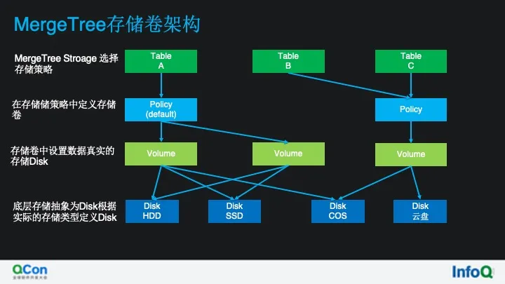 负责管理存储卷列表,定义当期存储策略下数据移动策略,以及磁盘预留等,默认情况下 ClickHouse 的默认存储策略为 default,存储策略是一个逻辑结构,不负责任何的 IO 请求。