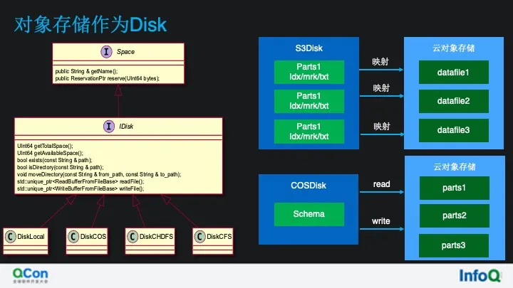 持久化 clickhouse 数据的接口,该接口的核心方法有: 创建文件夹、删除文件、写文件、设置磁盘预留等,这里的 Disk 不等同于块设备,而是 ClickHouse 读 写底层存储系统的一个接口,默认情况下 clickhouse 实现了 localdisk。