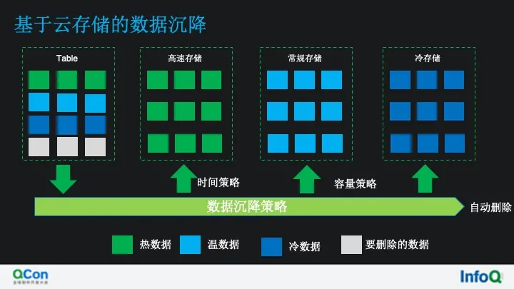 假设现在有这样一张数据表,里面包含 4 种类型的数据 热数据,近一个月经常要使用的数据,为了查询效率期望保存在高速存储上,比如存储介质是 SSD 的这 种存储上,随着时间的推移, 这部分数据变成了温数据,查询或者使用的频率不是那么的高,期望自动沉降到常规存储介质上。
