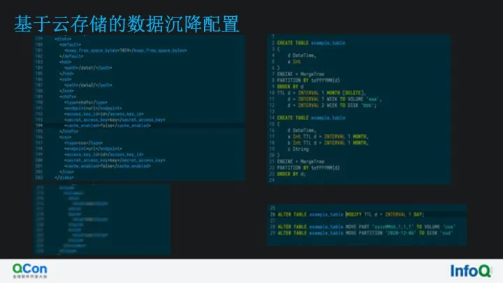 比如 HDD 的存储介质上,而更久的数据则使用频率更低,期望 自动沉降到云存储比如对象存储上,更早的数据希望自动删除,结合之前的介绍,我们实现了云存储 Disk,目前 ClickHouse 数据沉降策略支持按照 TTL、手动以及容量因子三种 方式进行沉降,接下来我们如何实现: