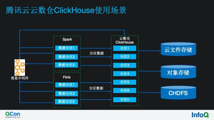Spark 的一个分区对应 ClickHouse 的一个分区,或者 Kafka 的 topic 分区对应 ClickHouse 的分区, 这样性能可以达到最优,数据写入的方式可以是 Spark 或者 Flink 直接写入到 ClickHouse 也可以通过消息中间件在流入 Kafka,写入的时候应该尽量大批次写,尽量规避小批次多次写,因为 ClickHouse 底层 数据结构是 mergetree,写入过于频繁会因为合并而导致性能下降。