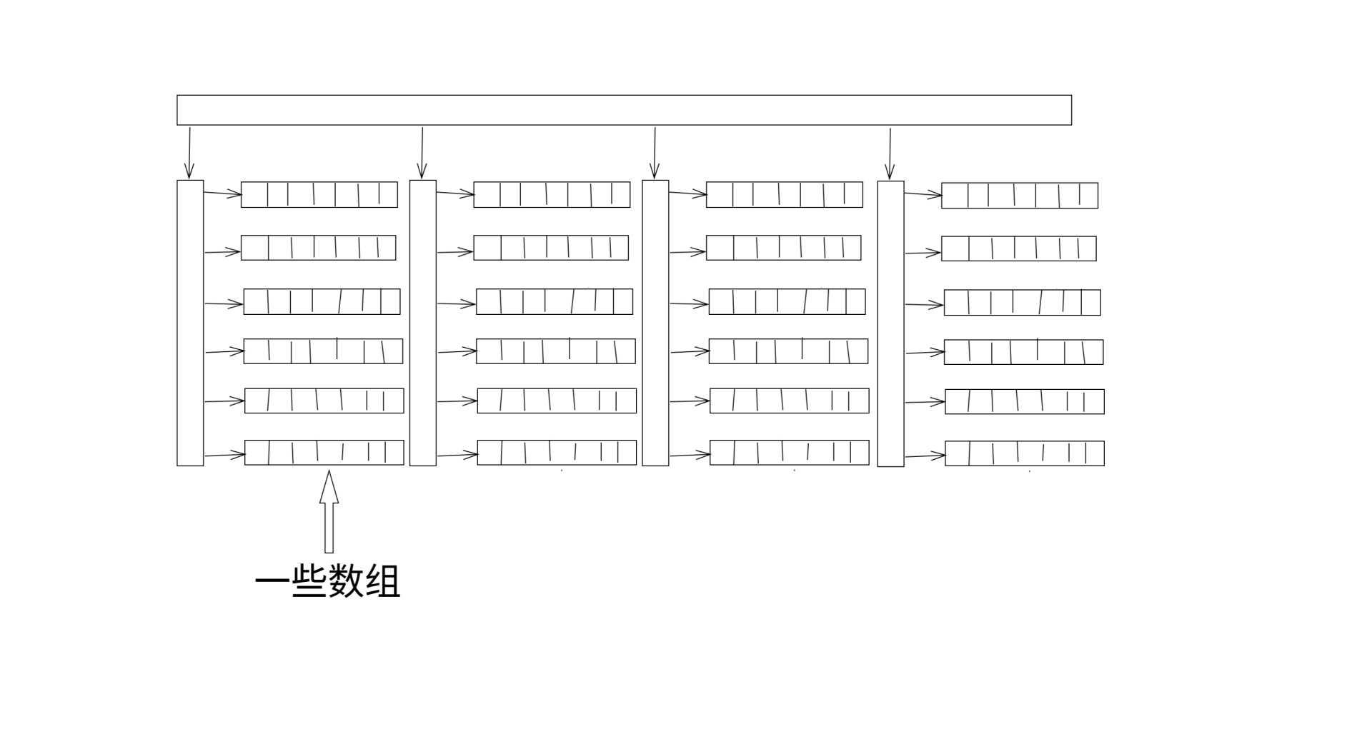 为了实现这一目标,我们将普通块状链表的内层数组换成块状链表,即块状链表套块状链表。这样就会形成下图所示的结构: