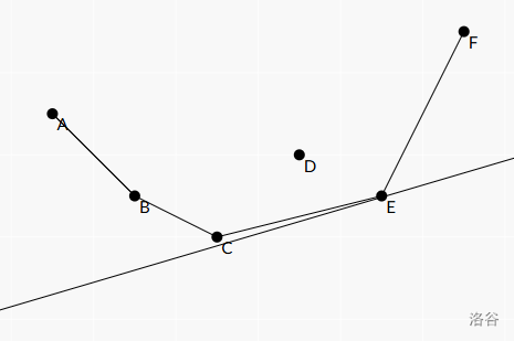考虑如何维护。假设上图按照字母顺序加点,已经加入 \(D\) 点。这个时候所有点都在下凸点集内。此时要加入一个点 \(E\),发现 \(D\) 点不能在下凸点集中,否则不下凸。