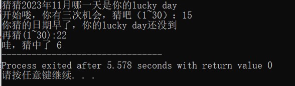 1 #include<stdio.h> 2 #include<stdlib.h> 3 #include<time.h> 4 5 int main() 6 { 7 int x,y,i,z; 8 srand(time(0)); 9 y=rand()%30+1; 10 z=0; 11 printf("猜猜2023年11月哪一天是你的lucky day\n开始喽,你有三次机会,猜吧(1~30):"); 12 13 for (i=0;i<3;++i){ 14 scanf("%d",&x); 15 if(x<y){ 16 z++; 17 printf("你猜的日期早了,你的lucky day还没到\n"); 18 if(z<3) 19 printf("再猜(1~30):");} 20 else if(x>y){ 21 z++; 22 printf("你猜的日期晚了,你的lucky day已经过了\n"); 23 if(z<3) 24 printf("再猜(1~30):");} 25 else{ 26 printf("哇,猜中了 6"); 27 break;} 28 29 if (z==3){ 30 printf("次数用完啦,偷偷告诉你:11月,你的lucky day是%d号\n",y);}} 31 return 0; 32 33 34 35 }