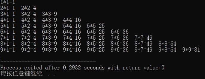 1 #include<stdio.h> 2 3 int main(){ 4 int i,j; 5 for(i=1;i<=9;i++){ 6 for(j=1;j<=i;j++) 7 printf("%d*%d=%d ",i,j,j*j); 8 printf("\n"); 9 } 10 11 }