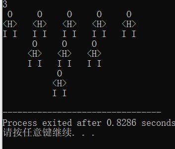 1 #include<stdio.h> 2 3 int main(){ 4 int i,j,n; 5 scanf("%d",&n); 6 for(i=1;i<=n;i++){ 7 for(j=1;j<i;j++) 8 {printf(" ");} 9 for (j=1;j<=2*(n-i)+1;j++){ 10 printf(" O "); 11 printf(" ");} 12 printf("\n"); 13 for(j=1;j<i;j++) 14 {printf(" ");} 15 for (j=1;j<=2*(n-i)+1;j++){ 16 printf("<H>"); 17 printf(" ");} 18 printf("\n"); 19 for(j=1;j<i;j++) 20 {printf(" ");} 21 for (j=1;j<=2*(n-i)+1;j++){ 22 printf("I I"); 23 printf(" ");} 24 printf("\n"); 25 26 } 27 return 0; 28 }