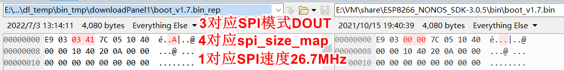 1、烧录时勾选DoNotChgBin,因此程序的SPI参数使用了boot_v1.7.bin里面的SPI参数设置。
