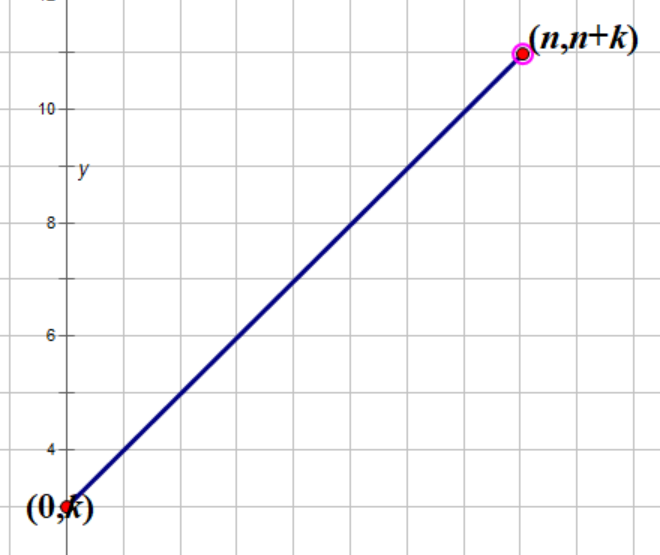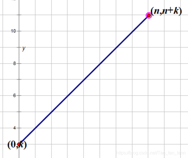 我们定义横坐标为当前来了的10元,纵坐标为当前来了的20元,起点为(0,0)。很明显,如果这个点移动到直线上面就不合法了。而终点是(n,m)我们求的是一直在直线下移动到终点的方案数。