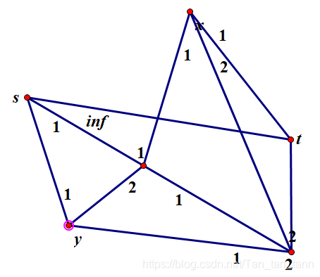 我们可以先建一个新原点,将必要弧的u连到y(汇点),将必要弧的v与x(源点)相连,在原先的源点与汇点间连一条容量为inf的边,这样就可以发现我们是否能将它跑完,如果y的进入流量未满,它就一定不能达到下界。