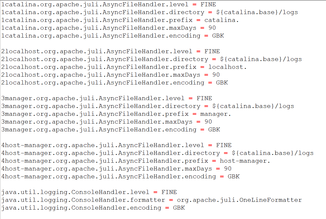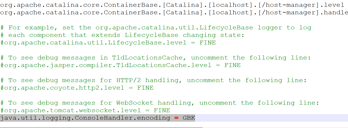 另外,如果需要解决Tomcat Localhost Log 和Tomcat Catalina Log窗口输出的日志乱码,可以将logging.properties文件中的所有UTF-8编码改为GBK编码,这样第2步可以省略,即logging.properties中java.util.logging.ConsoleHandler.encoding = GBK不用加上,也能解决Server窗口中的乱码
