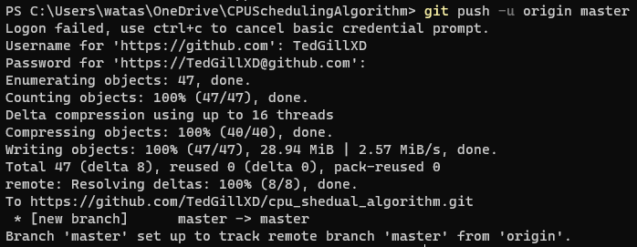 在链接在线仓库这一步骤中,我们使用git remote add origin 你的git仓库地址 指令来链接在线仓库,在这个案例中,我们的指令为git remote add origin https://github.com/TedGillXD/cpu_shedual_algorithm.git,如: