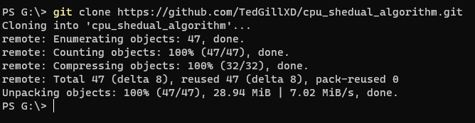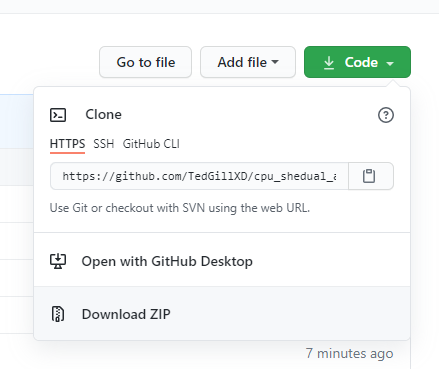 另一种方式就是使用git clone指令进行下载,同样的,我们点击Code按钮,在弹出的窗口中将HTTPS中的链接复制下来,在自己电脑中打开你想要存放项目的位置,右键点击git bash here,在弹出的命令提示符中输入git clone https://github.com/TedGillXD/cpu_shedual_algorithm.git命令,系统就会自动的为我们下载整个项目