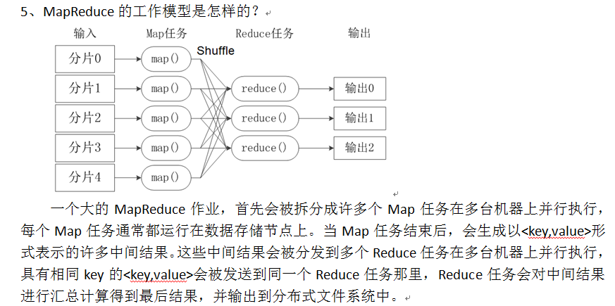 数据是保存在分布式文件系统HDFS中,所以,输入,从文件式分布系统当中输入数据,输入完以后进行相关的分片处理,一个分片对应一个map任务,交给map函数,Map里面包含了用户对数据的处理逻辑,所以这个Map任务会运行用户处理逻辑以后,输出处理结果,那这个处理结果是一堆的键值对,这些键值对并不直接发送给reduce任务。