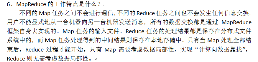 不同的Map任务之间不会进行通信,不同的Reduce任务之间也不会发生任何信息交换。用户不能显式地从一台机器向另一台机器发送消息,所有的数据交换都是通过MapReduce框架自身去实现的。Map任务的输入文件、Reduce任务的处理结果都是保存在分布式文件系统中的,而Map任务处理得到的中间结果则保存在本地存储中。只有当Map处理全部结束后,Reduce过程才能开始。只有Map需要考虑数据局部性,实现“计算向数据靠拢”,Reduce则无需考虑数据局部性