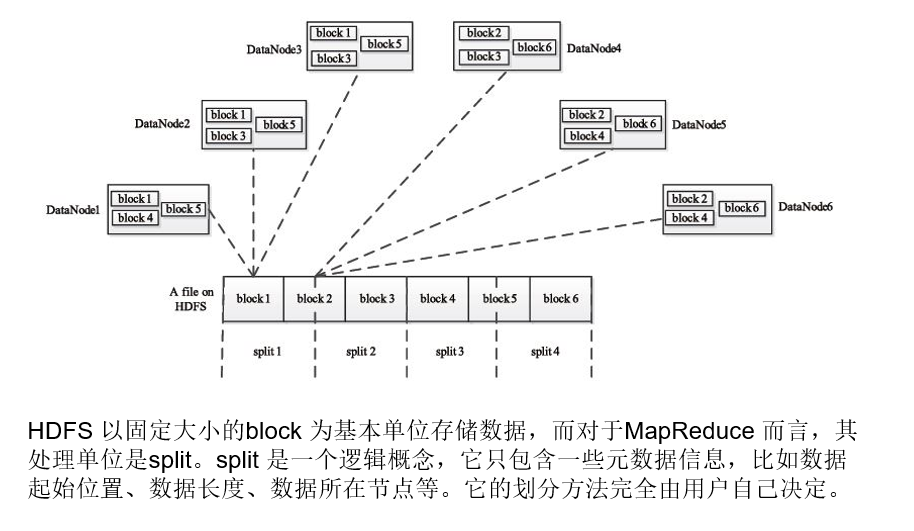 HDFS以固定大小的block为基本单位存取数据,而对于MapReduce而言,其处理单位是Split。Split 是一个逻辑概念,它只包含一些元数据信息,比如数据起始位置、数据长度、数据所在节点等,它的划分方法完全由用户自己决定。 但大多数情况下,理想的分片大小是一个HDFS块。(下图的分片是有问题的,split1和split4的数据分片涵盖了两个数据节点,Map任务执行时需要移动数据。)