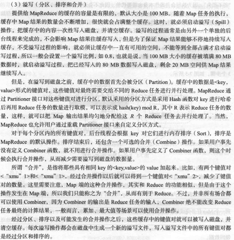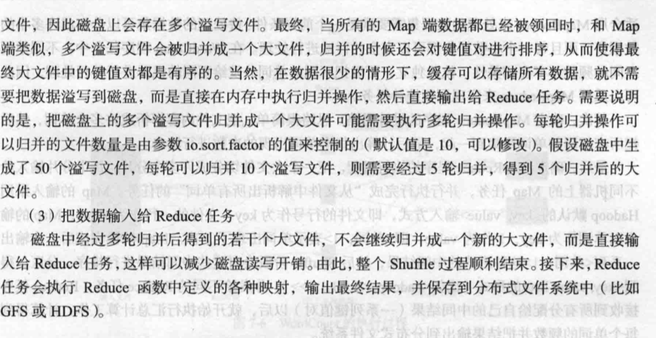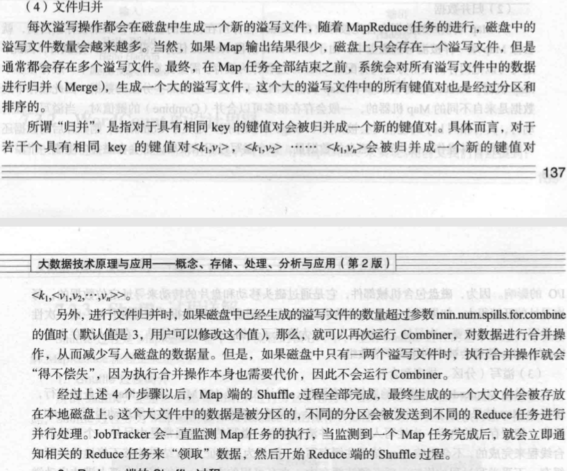 随着溢写的多次发生,最终在磁盘上会有多个溢写文件,这多个溢写文件,最终在整个Map任务运行结束之前,系统会进行归并,放入本地磁盘。这大的文件里面的键值对都是分区的而且是排序的。