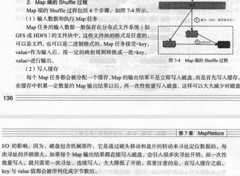 第三步,从分布式文件系统各个分片中把数据读入,读入以后生成相关的(key,value)键值对,然后提交给map任务去执行,Map里面包含了用户编写的应用程序处理逻辑,然后会输出一堆相关的(key,value),输出结果不是直接写入磁盘,也不是直接发送给reduce任务,而是先写到缓存。