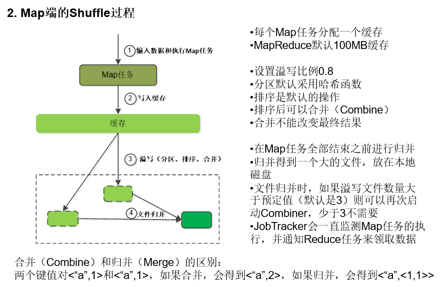 可能发生的操作:合并(Combine)和Merge不是一个概念,要区分开。合并是为了减少溢写到磁盘当中的数据量。由两个键值对合并完之后变为一个键值对,由此,可以减少很多键值对,这样写入的数据量就会大大减少