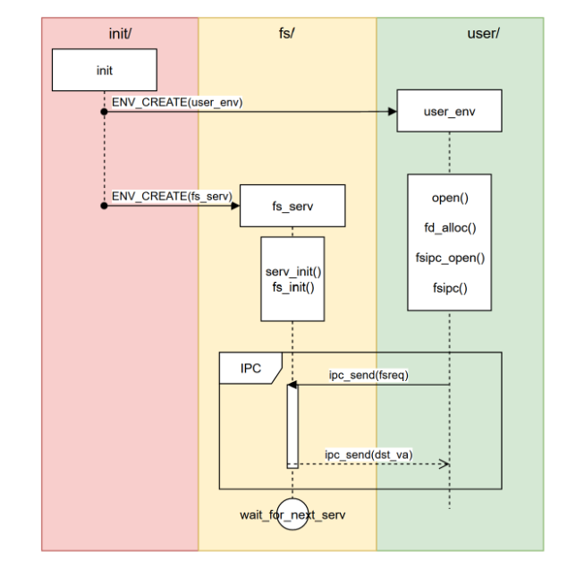 要解答这两个问题首先让我们来看一下上述步骤中每一步所在的具体文件。文件系统的启动以及响应处理函数在fs/serv.c中,而文件系统具体执行文件操作的所有函数则在fs/fs.c文件中。
