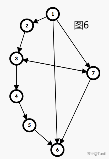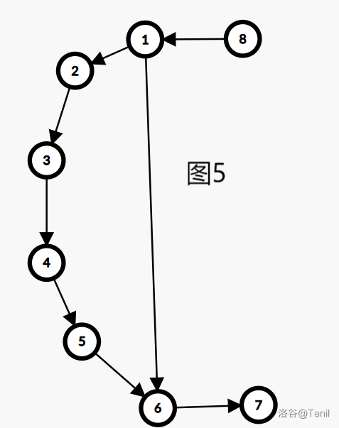 对图 5 情况,若新加点连边为 $ \left \langle 8,1\right \rangle $ 或 $ \left \langle 6,7\right \rangle$,则直接成立(情况 B);若为图 6 情况,考虑链上任意一点(此例为 3),若 3 与 7 之间连边为 $\left \langle 3,7\right \rangle $,则 3,4,5,6,7 部分与整体形似,可以类似上述考虑方式地分隔,直至达成情况 A 或情况 B,或者分隔出的联通块阶数为 2,一定成立。3 与 7 之间连边为 $ \left \langle 7,3 \right \rangle $ 同理。