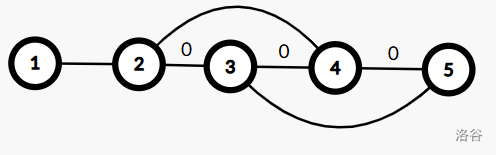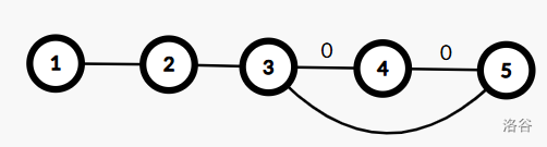 我们先按删两条边使图不连通的方式,删掉 \((3,4),(4,5)\)(上面的 0 表示删除),发现 4 断开了。如果我们想要图连同,只需存在一条由其他点到 4 的边,比如 \((2,4)\)。