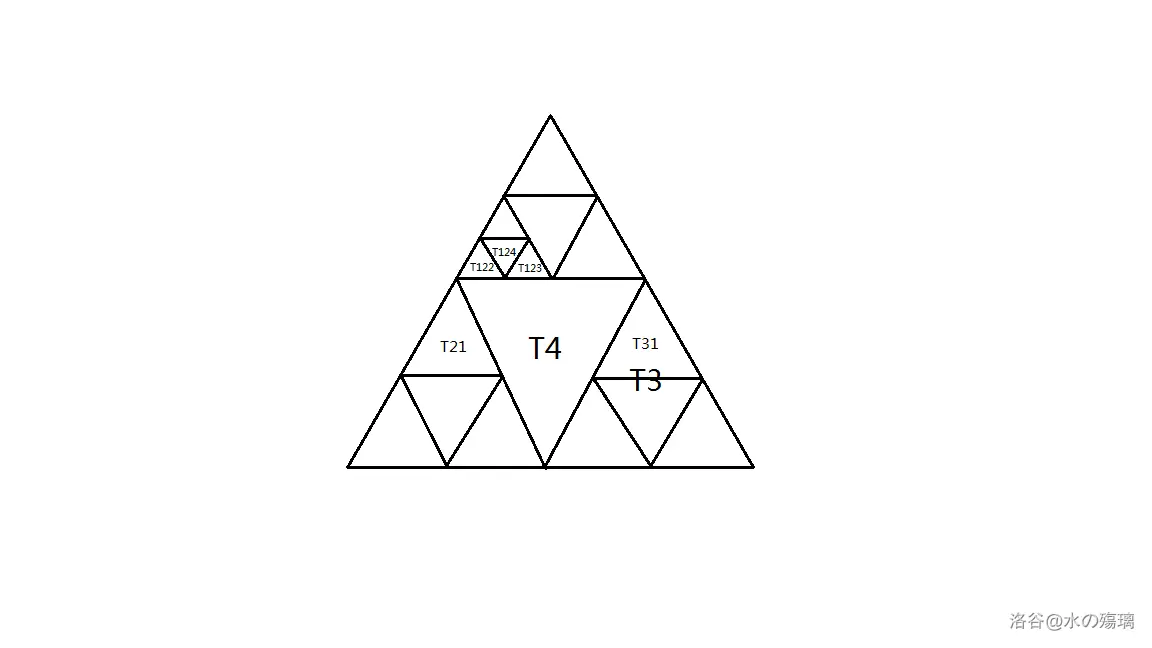至于每个三角形的编号,大概是递归式的,每一个字符代表着四个部分中的一个,其中4表示中间的三角形,显然只可能出现在末位,然后下一个字符就继续分四个部分。