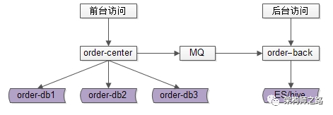 对于像订单中心一样复杂的“多key”类业务,在数据量较大,需要对数据库进行水平切分时,对于后台需求,采用“前台与后台分离”的架构设计方法: