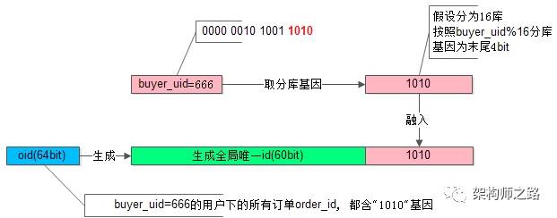 通过buyer_uid分库,假设分为16个库,采用buyer_uid%16的方式来进行数据库路由,所谓的模16,其本质是buyer_uid的最后4个bit决定这行数据落在哪个库上,这4个bit,就是分库基因。