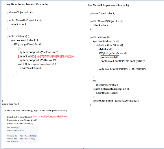 - wait、notify以及notifyAll都是Object对象的方法,他们必须在被 synchronized 同步的方法或代码块中调用,否则会报错。