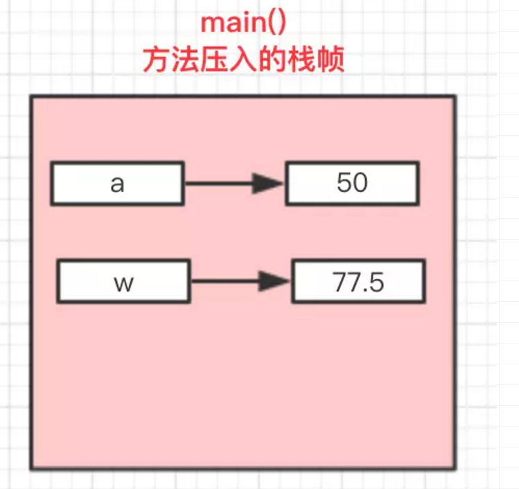 首先程序运行时,调用mian()方法,此时JVM为main()方法往虚拟机栈中压入一个栈帧,即为当前栈帧,用来存放main()中的局部变量表(包括参数)、操作栈、方法出口等信息,如a和w都是mian()方法中的局部变量,因此可以断定,a和w是躺着mian方法所在的栈帧中