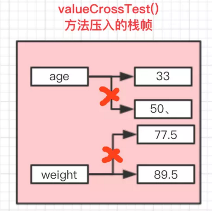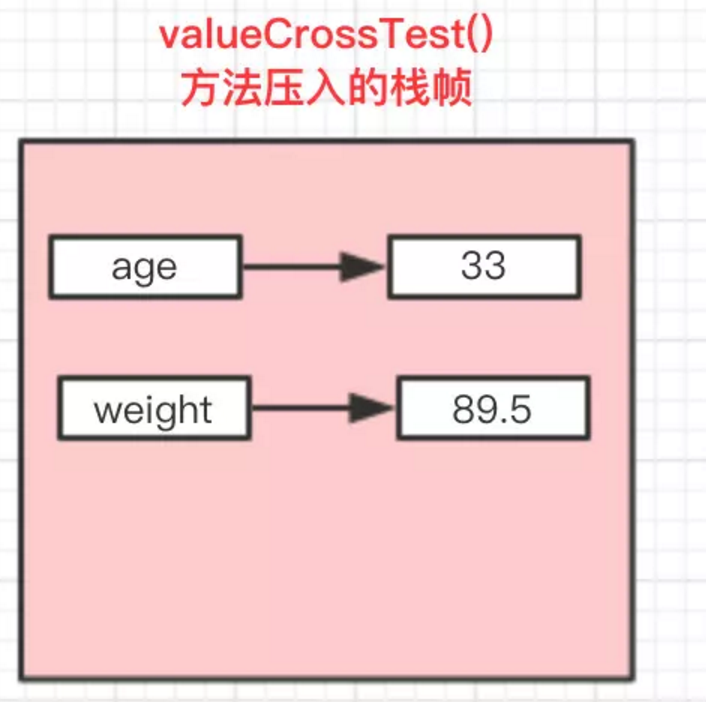 而当执行到valueCrossTest()方法时,JVM也为其往虚拟机栈中压入一个栈,即为当前栈帧,用来存放valueCrossTest()中的局部变量等信息,因此age和weight是躺着valueCrossTest方法所在的栈帧中,而他们的值是从a和w的值copy了一份副本而得,如图: