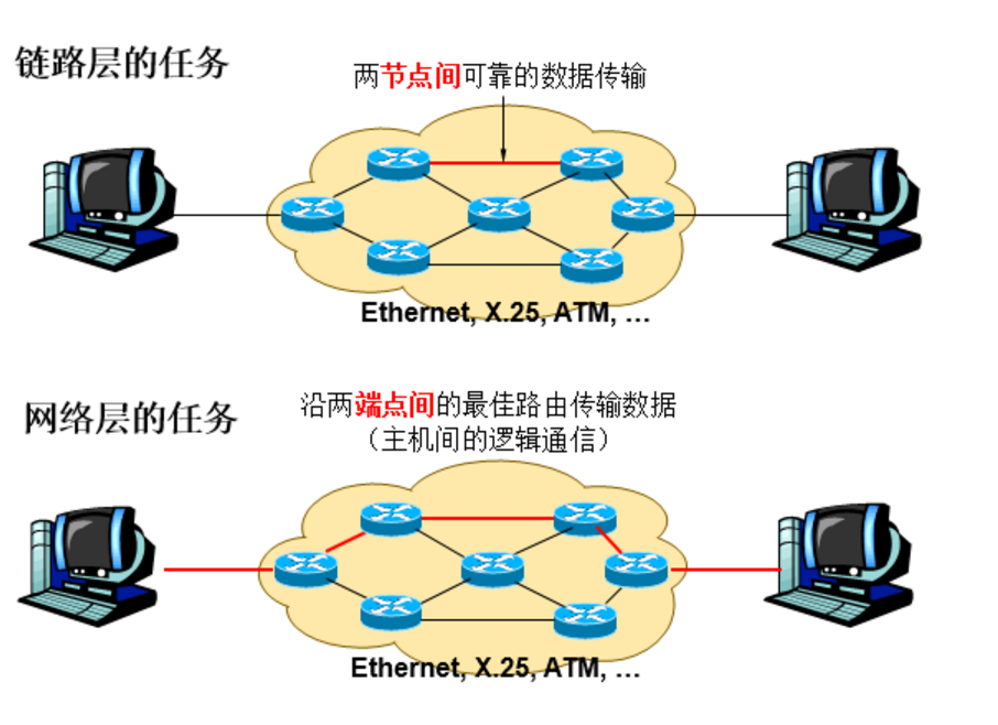 - 网络层:路由选择,使传输层传下来的分组能正确无误到目的站,并交付给目的站的传输层