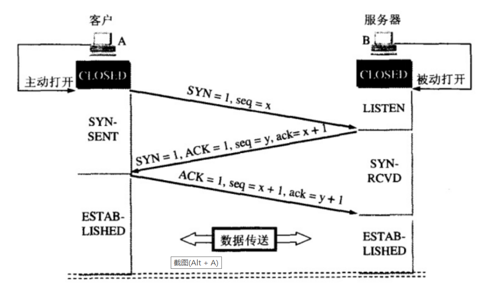 客户端向服务端发送连接请求报文段。该报文段的头部中SYN=1seq=x。请求发送后,客户端便进入SYN-SENT状态。