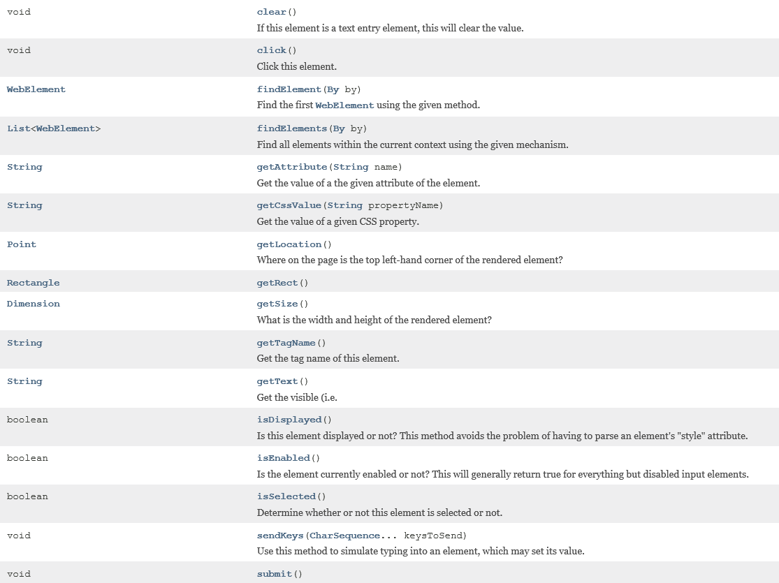 在WebDriver中,大多简单有效的页面交互的方法都是通过WebElement接口提供,最常用的操作页面元素方法有如下几个: