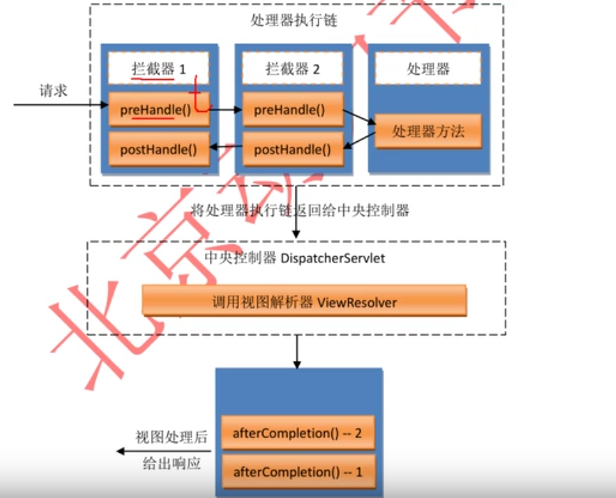 1、当俩个拦截器都实现放行操作时,顺序为preHandle 1,preHandle 2,处理器方法、postHandle 2,postHandle 1,afterCompletion 2,afterCompletion 1