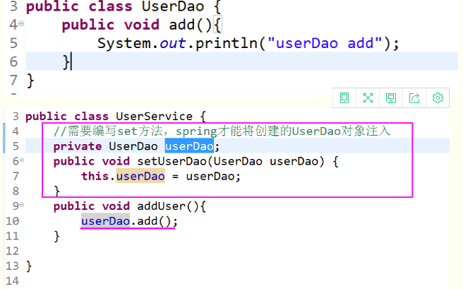 UserService中有使用userDao对象,这个我们都很熟悉的使用伎俩,service层调用dao层的方法。按照往常我们的写法,在service中需要自己new出UserDao对象,但是在spring中就不需要了,一切对象都让spring帮我们创建。