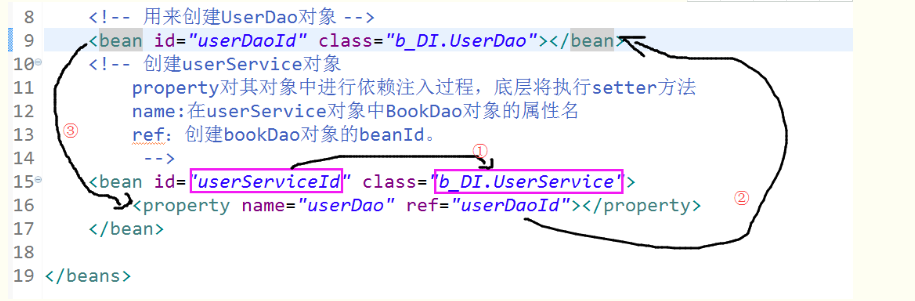 过程就如图中所画,先创建UserService对象,然后在根据property中的ref找到userDaoId并创建UserDao对象,然后根据property中的name,通过setter方法注入,这样就完成了依赖注入。
